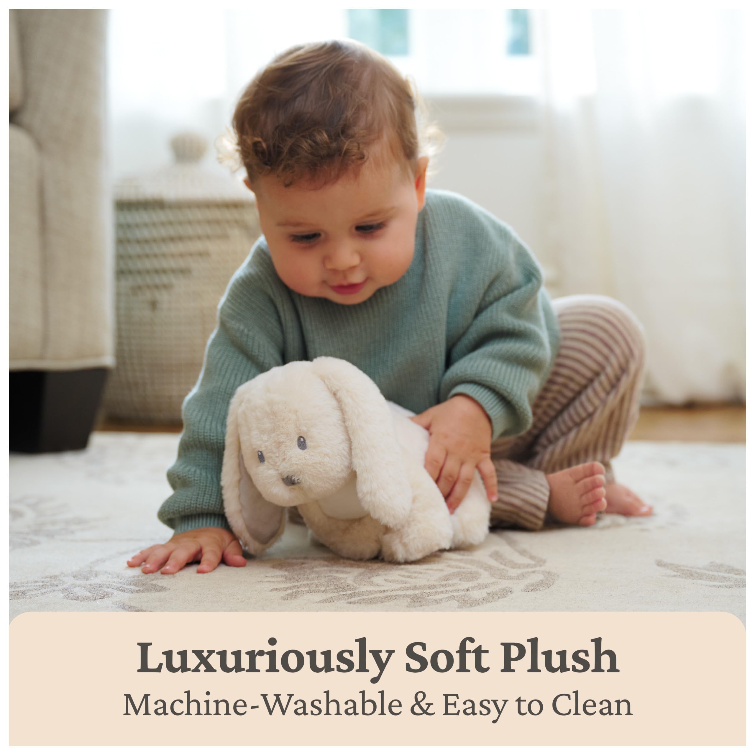 - CLOVER BUNNY PLUSH: This floppy-eared 10” seated bunny is ready to snuggle or snooze with baby Clover boasts luxuriously soft cream plush, silver embroidered details, a white puffball tail, and shiny silver satin ears for additional tactile play