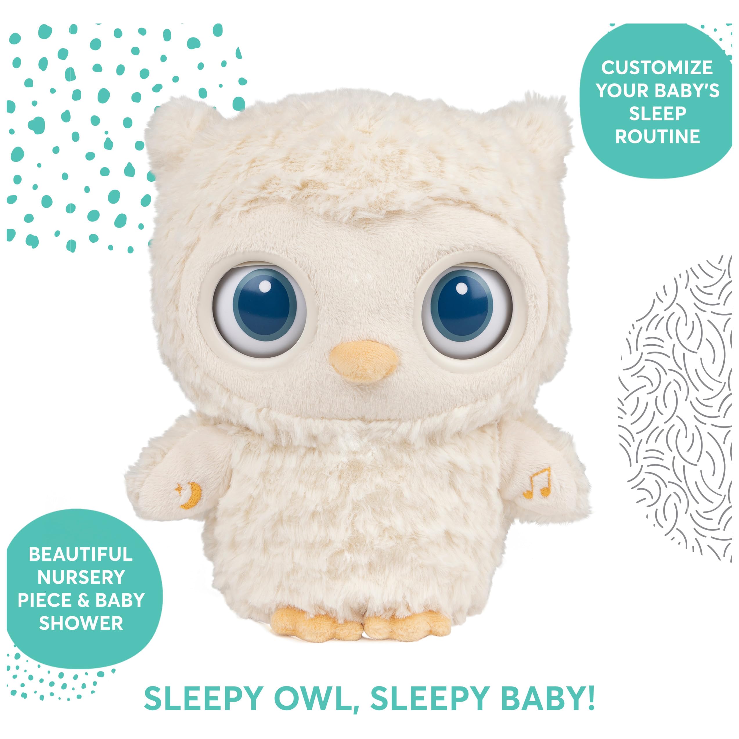- SLEEPY OWL SOOTHER: This soft, cuddly owl features sleepy eyes, 7 soothing sounds, tranquil melodies and gentle LEDs to relax baby. The plush owl can barely keep its big, round eyes open as they droop and close to the soothing sounds and music