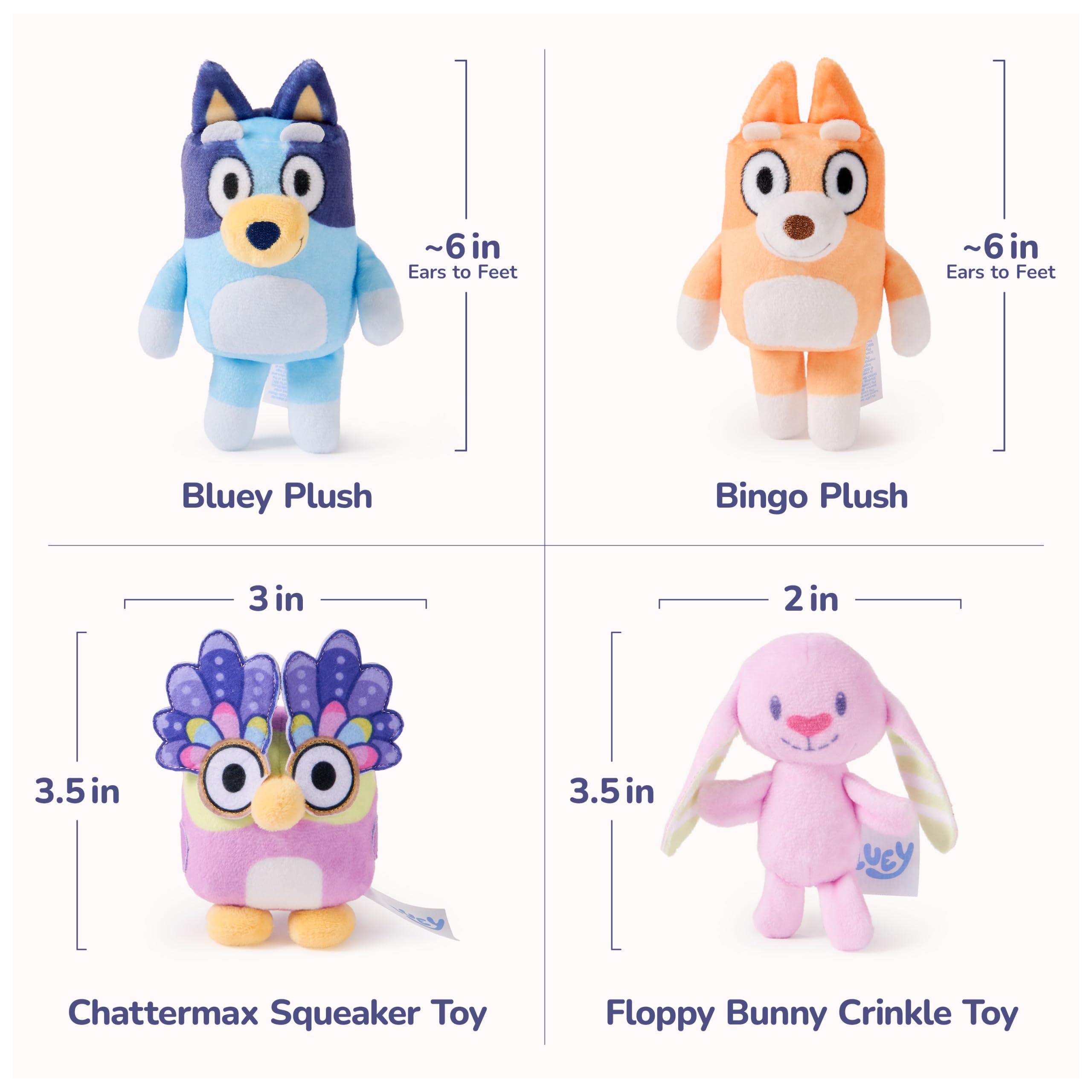 - Bluey Plush Playset: Bluey and Bingo are here to play This soft plush playset features Bluey’s family car, which neatly stores 4 soft sensory toys: mini Bluey and Bingo plushies, a Chattermax squeaker toy, and a Floppy bunny crinkle sensory plush