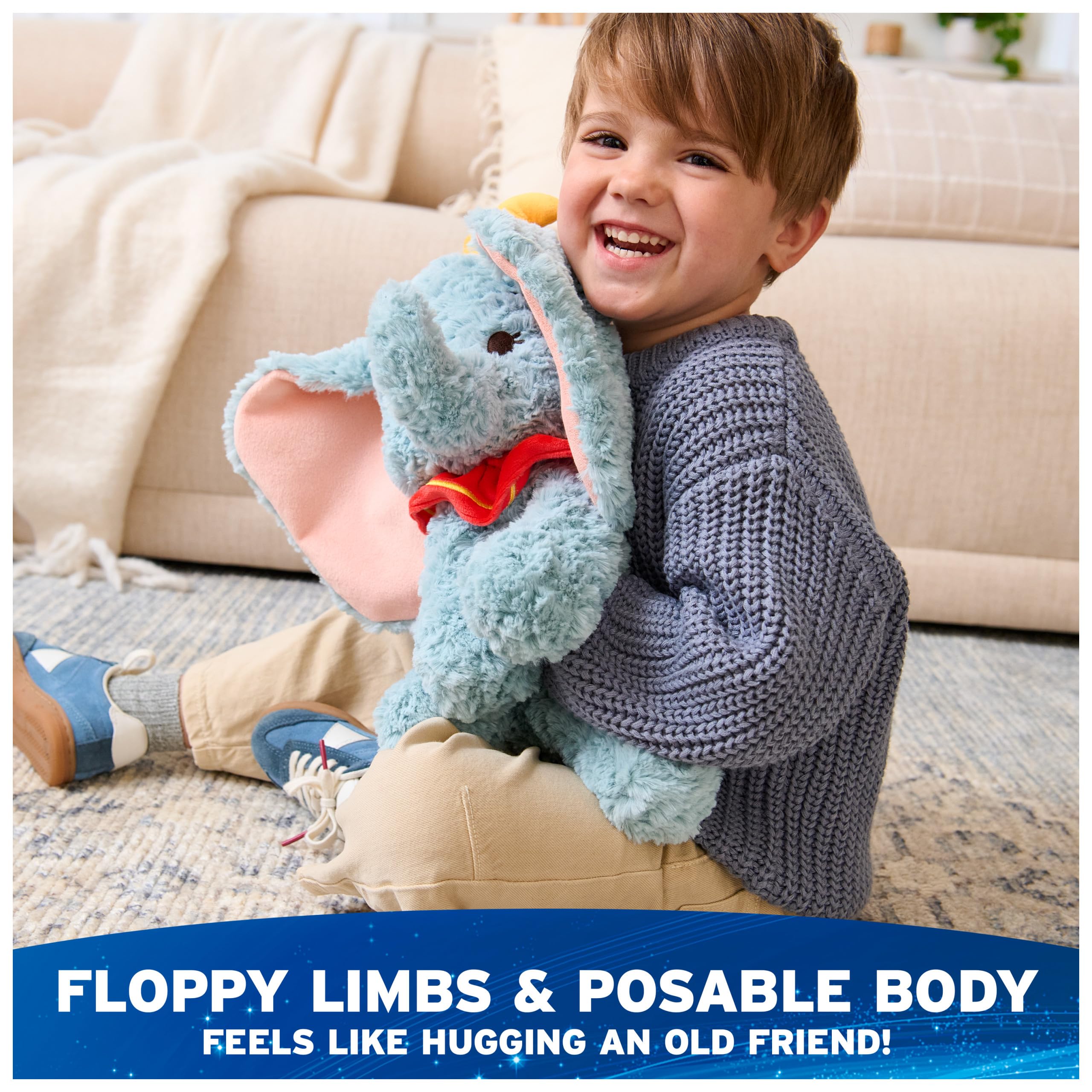 - DISNEY’S DUMBO PLUSH: This elephant sits 10” tall and has soft, floppy limbs with a slightly under-stuffed body that makes every squeeze feel sweeter. Dumbo has soft blue-gray plush, oversized ears, and wears his yellow hat and red clown collar