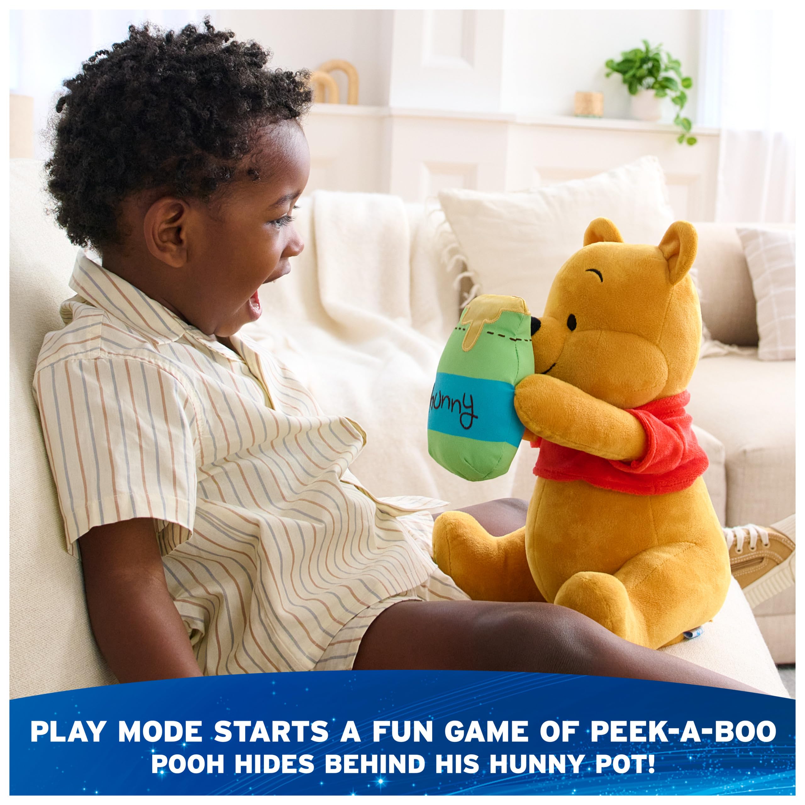 - INTERACTIVE PLAY: Play and count with Pooh Bear This plush features 2 interactive modes and over 20 phrases to keep babies and toddlers entertained. Press either foot to engage Winnie the Pooh in a game of peek-a-boo or teach little ones to count to 3
