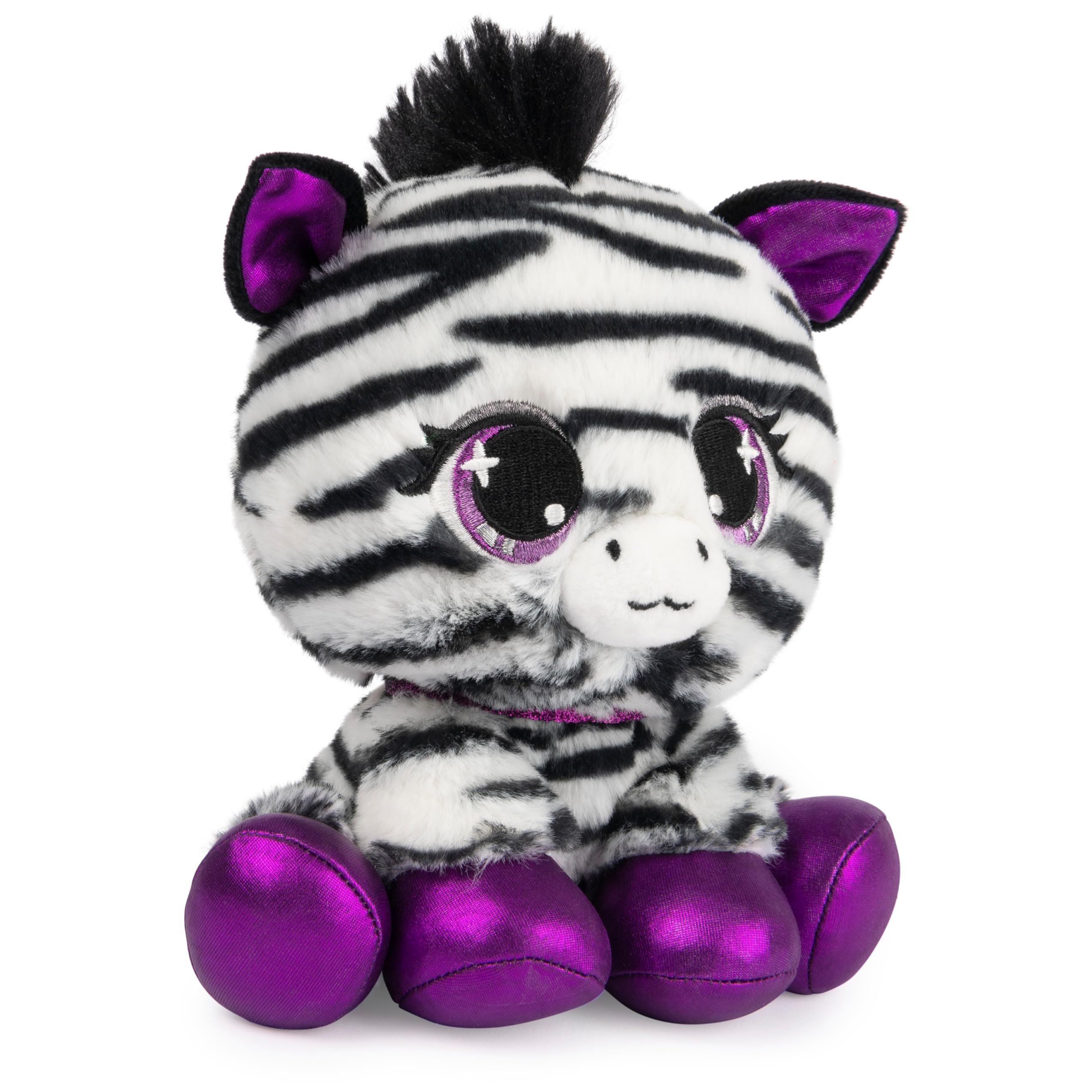 - DESIGNER FASHION PET: Alexia Zara is a stylish, fun zebra with a bold black-and-white striped plush pattern, highlighted by metallic violet accents in her ears and hooves. She also features sparkling purple eyes and a matching glitter collar.
