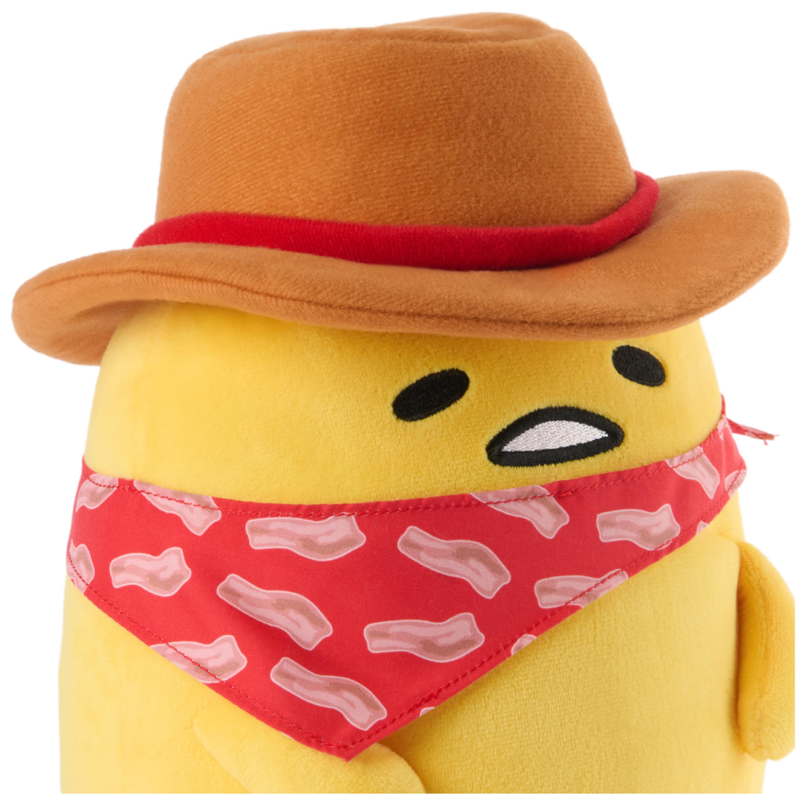 - Gudetama Cowboy: This large, huggable 9” plush features Gudetama dressed in Western flair with a fun cowboy hat and a red bacon-pattern bandana around its neck. It makes an exciting gift and display piece for collectors and pop culture fans